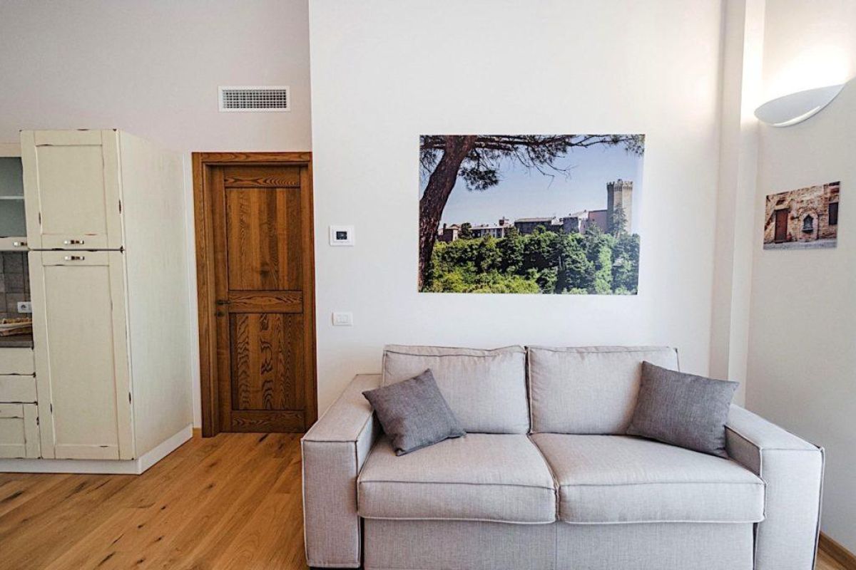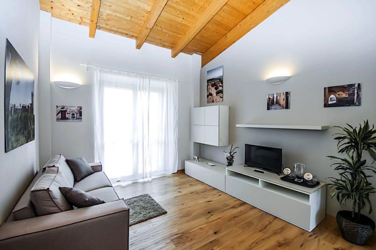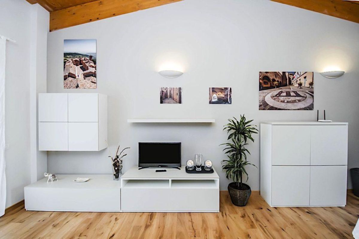 Nell’ambiente unico all’ingresso, dove si trova la cucina e il soggiorno è presente un divano letto per due persone e un televisore sintonizzato su canali del digitale terrestre e satellitari. Un disimpegno divide il soggiorno dal bagno e dalla camera da letto. Il bagno ha il box doccia, il lavabo, il bidet, il water, la lavatrice. Il soggiorno e la camere da letto sono molto luminosi e affacciano su un grande balcone, con sdraio, un ombrellone, un tavolo e delle sedie.