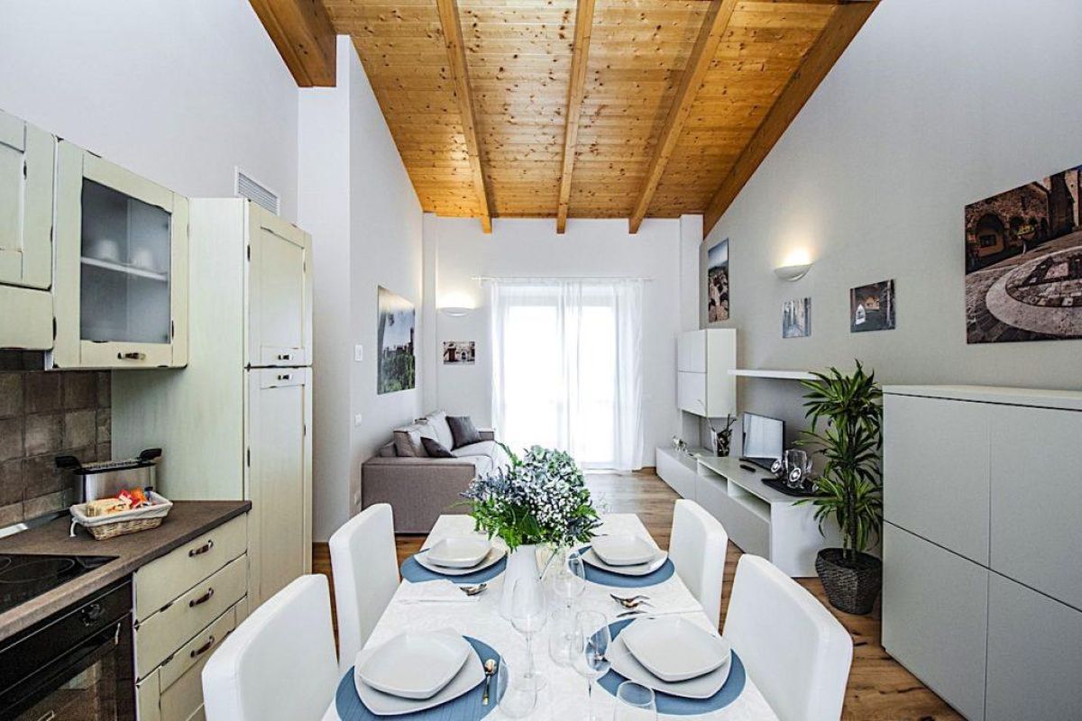 Gli interni sono moderni e luminosi e sono tutti dotati di wifi e di un sistema innovativo di aria condizionata. L’appartamento è suddiviso in un soggiorno con cucina a vista, due camere con letti matrimoniali e un bagno. La cucina è dotata di un piano cottura a induzione a quattro fuochi, frigorifero, tostapane, bollitore, stoviglie, tavolo e sedie per sei persone.